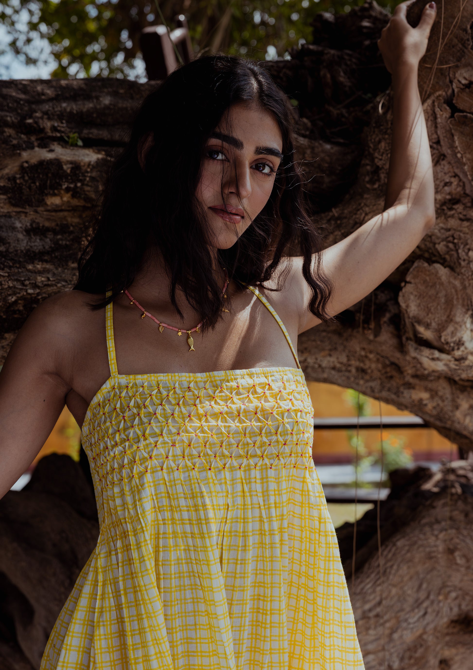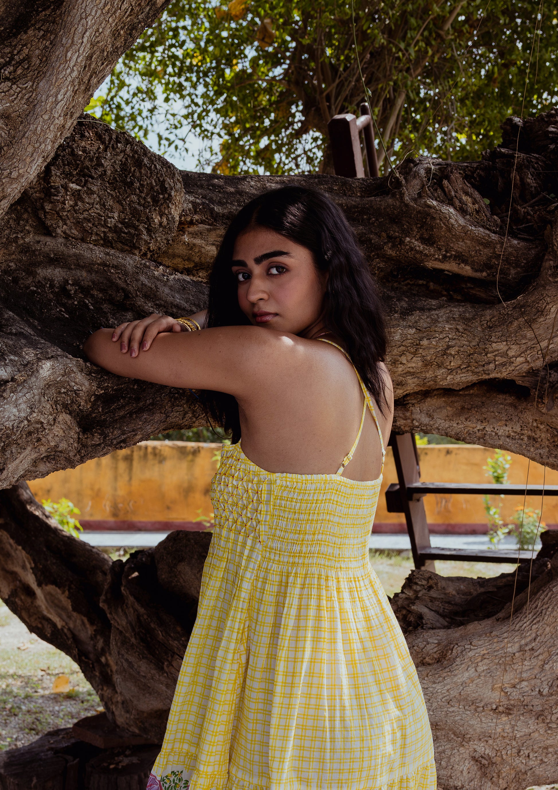 Crafted in soft cotton cambric, the Jaali Dress is hand block-printed in a playful checkered pattern and lined for comfort. Embroidered, origami-like details highlight the body, while the bottom tier features delicate Saras crane motifs, adding a layer of heritage artistry. Designed as a short, strappy dress with a racer back, it carries a breezy, beach-ready charm. The back is smocked, giving a better fit at the body and making it easy to wear. Flowy in movement, with hand-embroidered accents that refine the fit, this piece blends ease, craft, and versatility in equal measure.