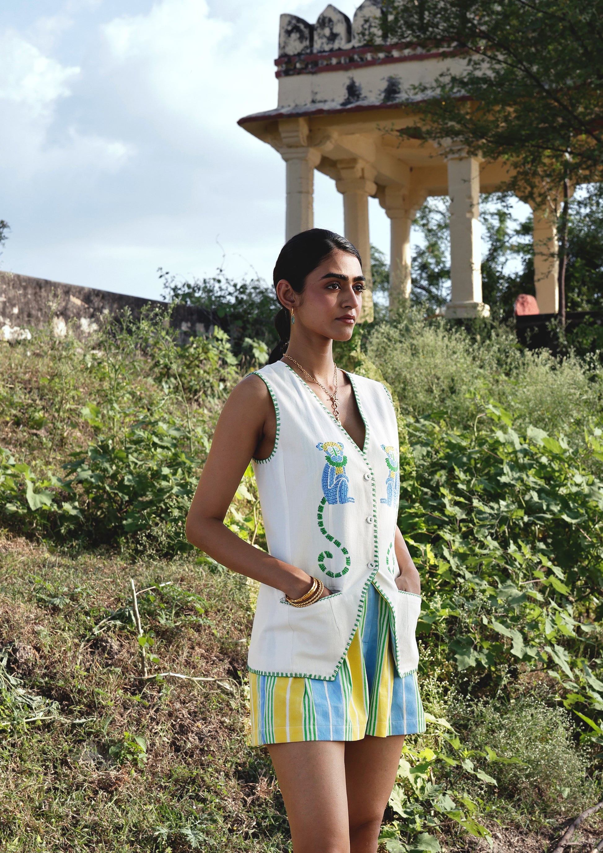 Crafted in cotton twill, the Mango Shorts are hand block-printed in vibrant multi-colour stripes using azo-free dyes. Designed with an elasticated back and front button closure for a secure yet flexible fit, the shorts sit neatly at the waist while keeping a relaxed, easy volume at the thighs. Thoughtful craft meets effortless wearability, making them a versatile essential. Styled here with the Vrinda Vest in Monkey Block Print.