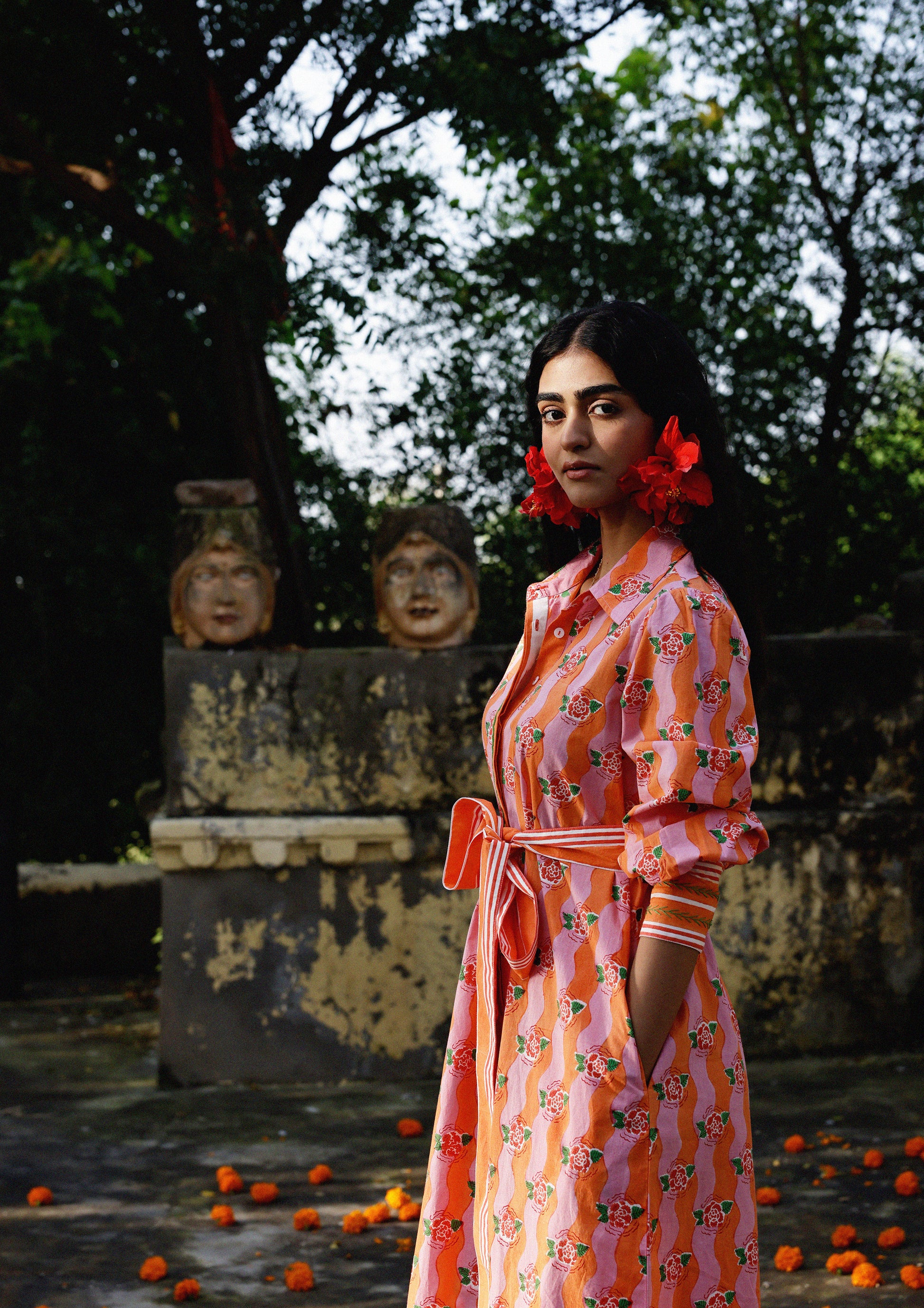 True to its name, the Mughal Shirt Dress is crafted as a button-down style with a relaxed, roomy fit. Hand block-printed in azo-free colours on crisp cotton poplin, it features the flowing Orange Ganga print that brings heritage artistry into a contemporary silhouette. Delicate hand-embroidered details on the cuffs and placket add artisanal finesse. Versatile in style, it can be worn with or without the belt, shifting easily between laid-back ease and a more refined look depending on the mood and occasion.