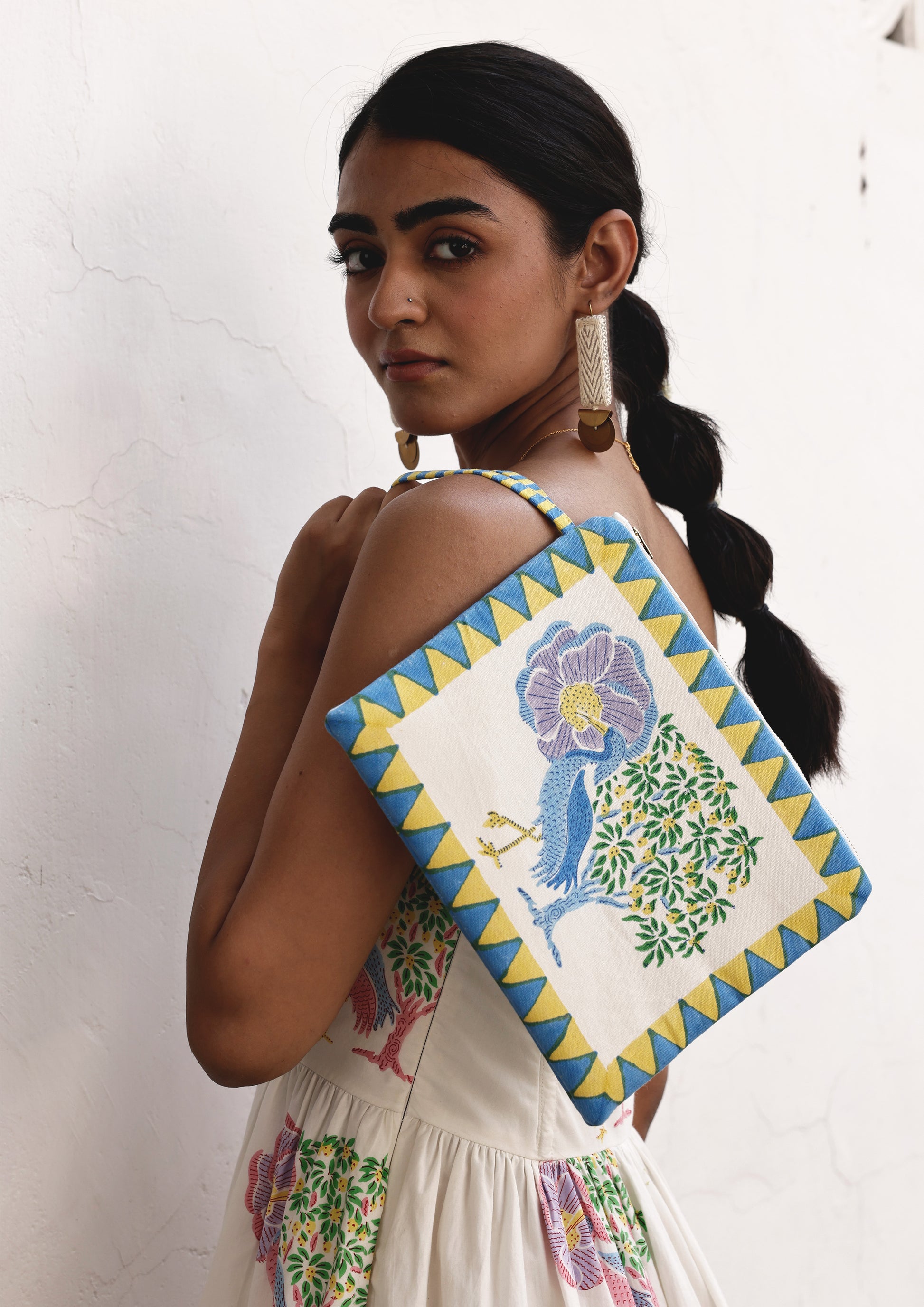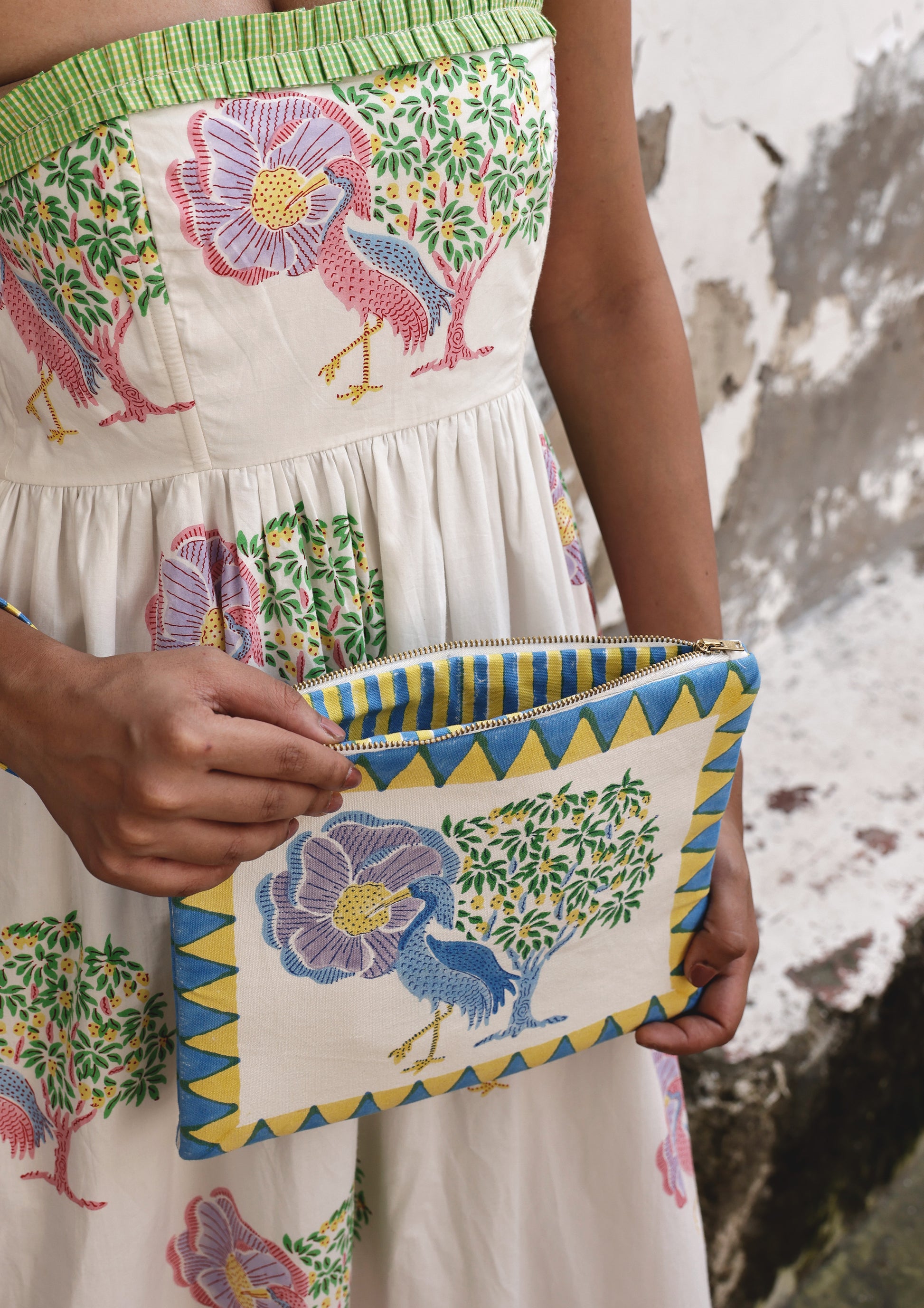 This charming pouch is hand block-printed on durable cotton canvas, featuring Saras crane motifs on both sides framed by colorful triangular borders. The inside is lined with subtle stripe block print, and a golden zipper completes the design with a touch of shine. Compact and practical, it brings together handcrafted artistry and everyday functionality in a fresh, stylish way.