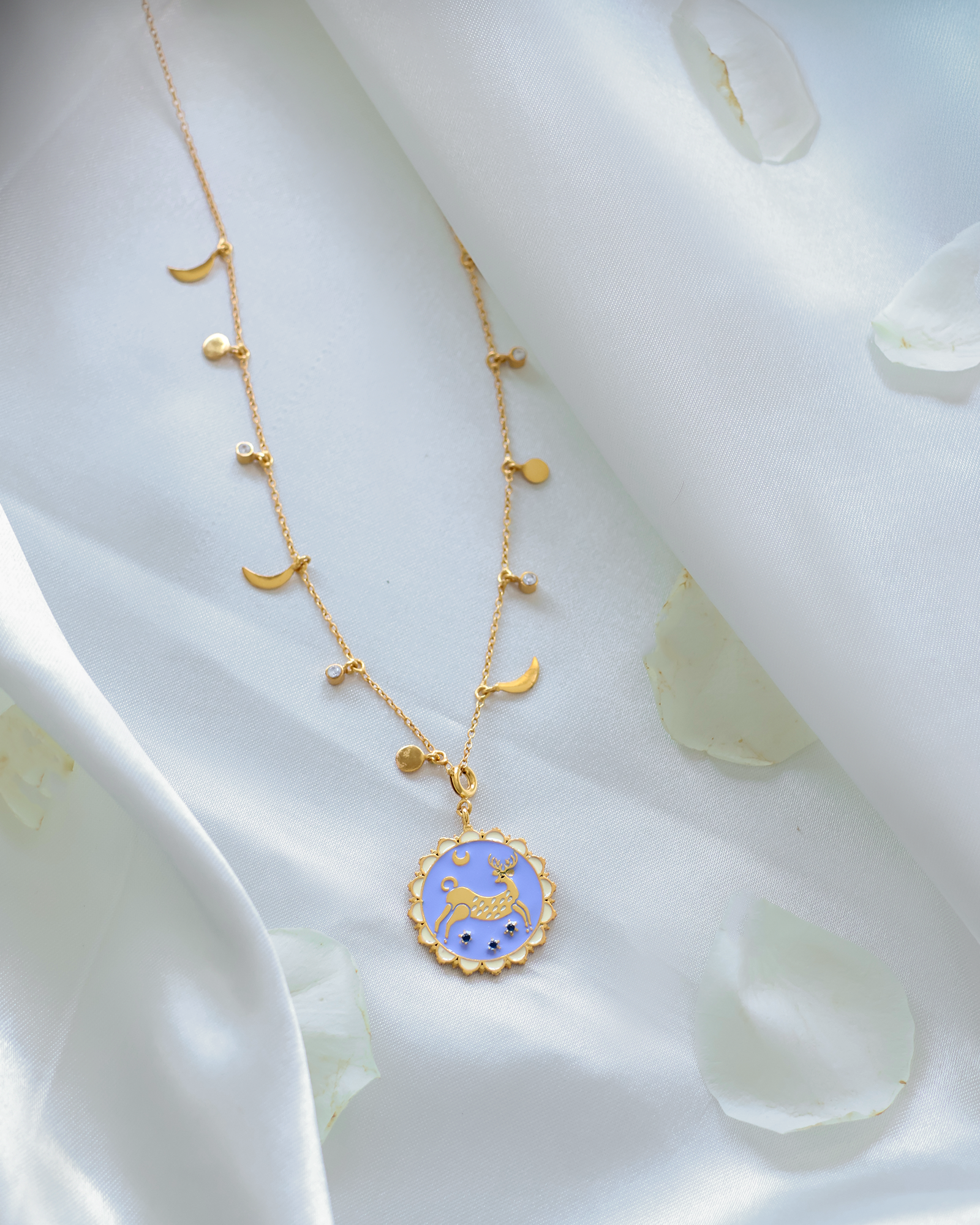 The Swamp Deer Meenakari Necklace is inspired by the elegant swamp deer, the state animal of Uttar Pradesh, symbolizing grace and resilience.Handcrafted in brass and plated in 22k gold (0.25 micron), it features fine meenakari detailing that highlights the beauty of the design. The chain is adorned with sun and moon charms and zircon settings, adding a celestial sparkle to its charm.Each piece is handmade, celebrating the union of nature, craftsmanship, and timeless elegance.