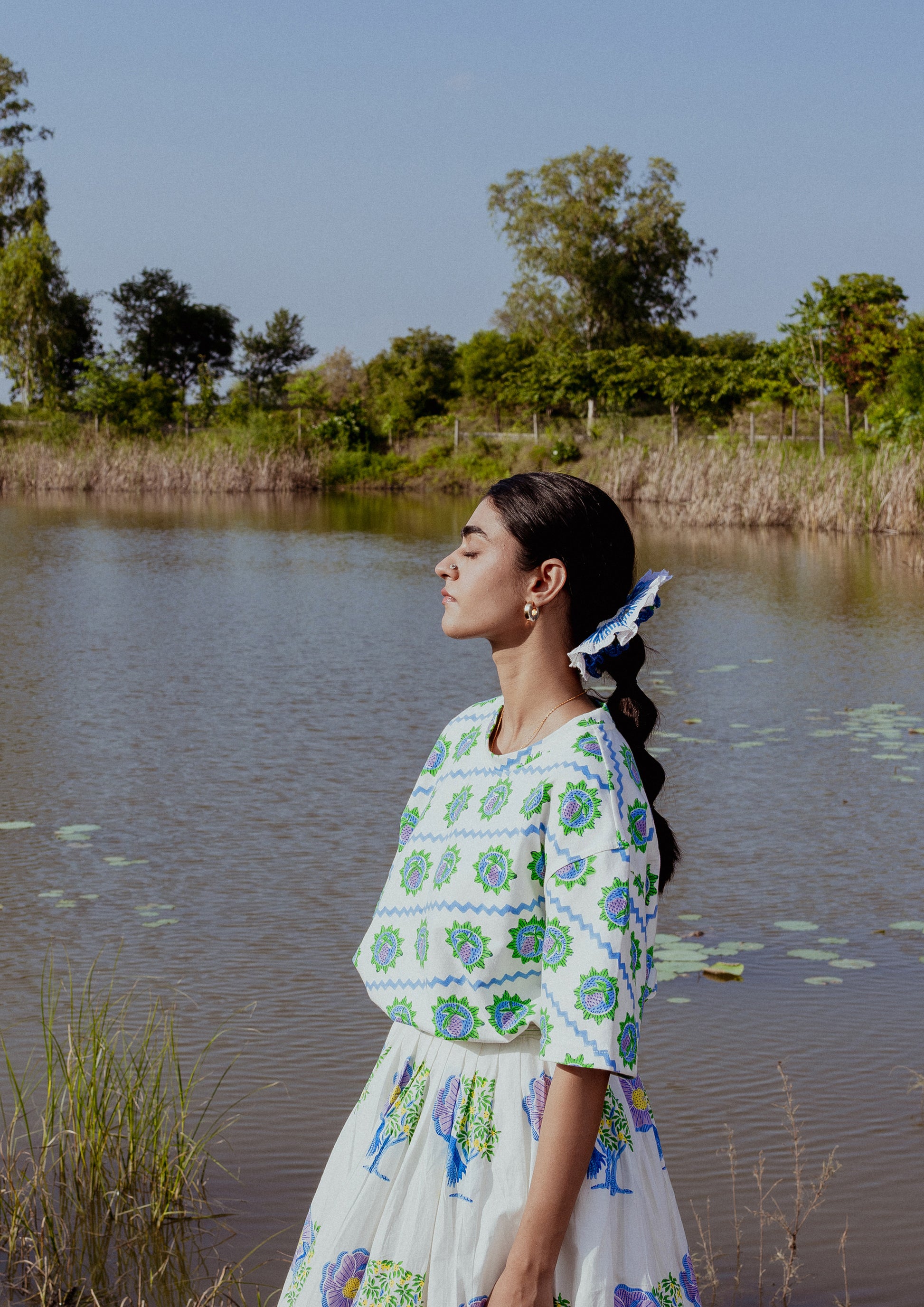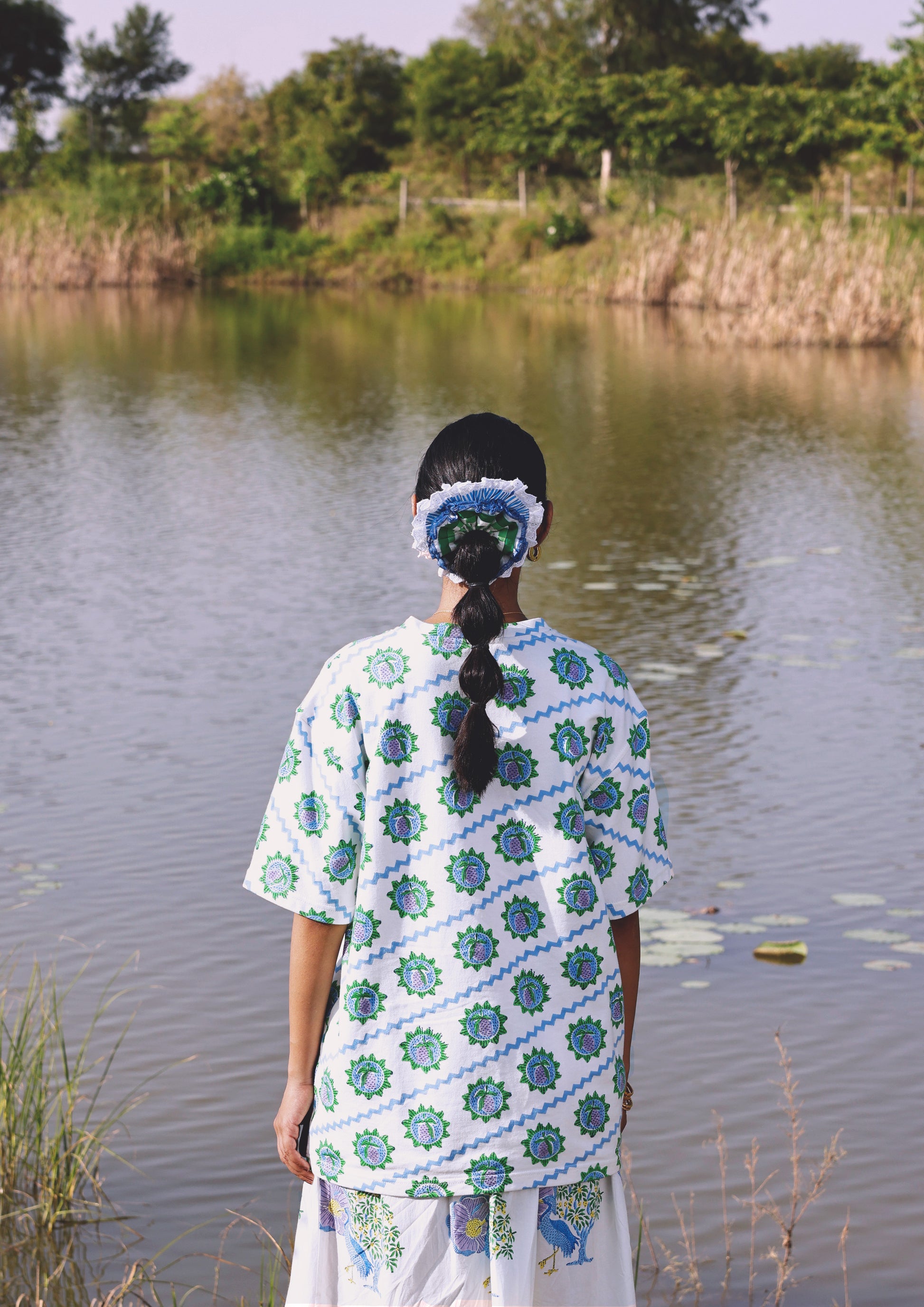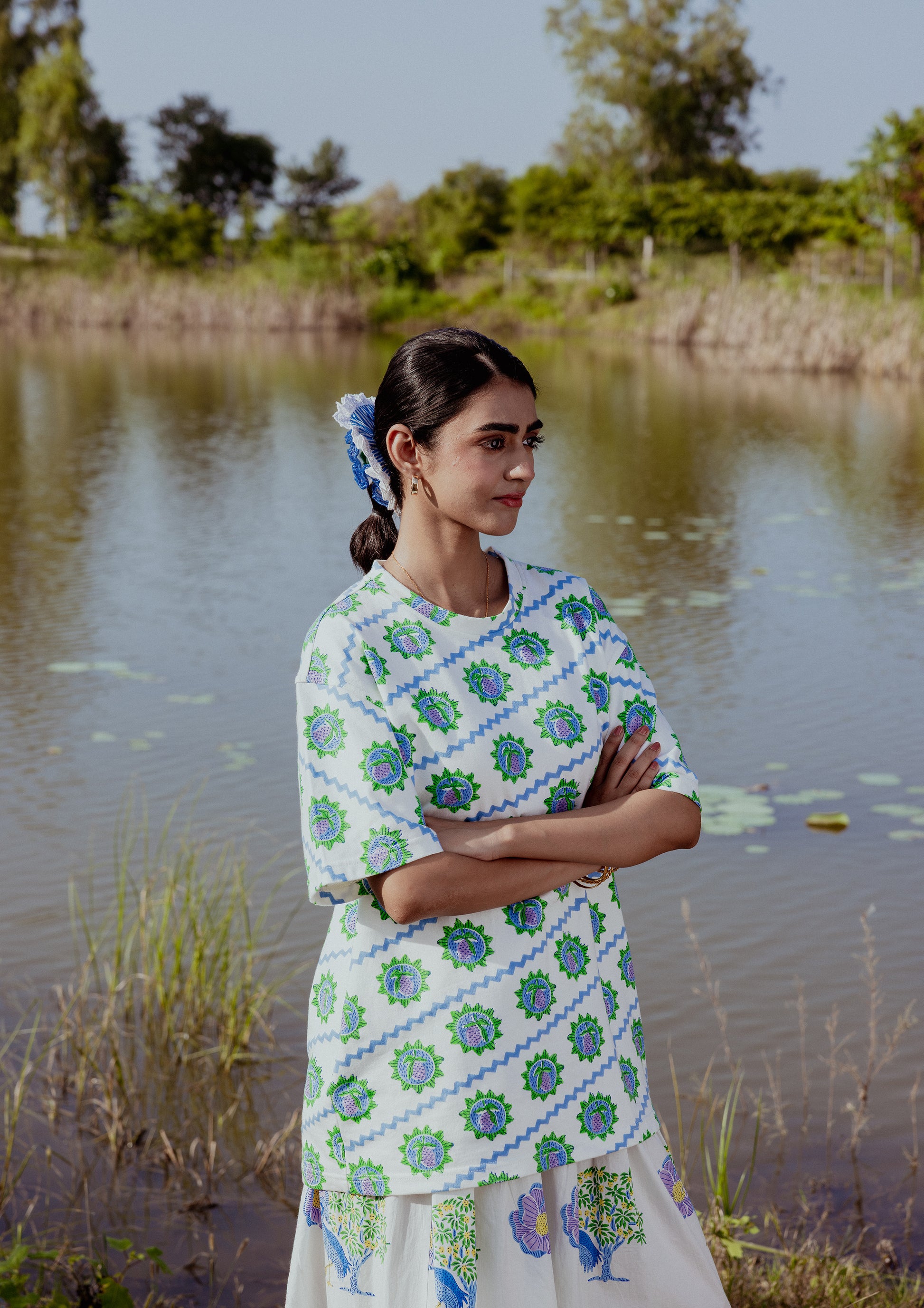 Crafted in soft terry cotton, this Unisex T-Shirt is hand block-printed in the vibrant Mango motif. Designed with an oversized fit, it offers effortless versatility, making it an easy staple for all genders. Its relaxed silhouette pairs seamlessly with jeans for everyday wear, while still carrying the artisanal charm of block printing. Styled here with our Bawari Skirt in Saras Crane Print.