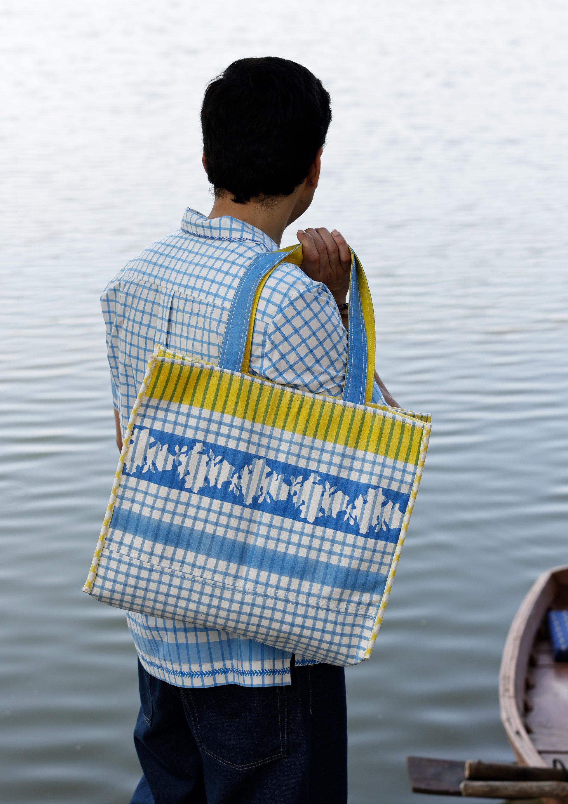 Hand block-printed on sturdy cotton canvas, this tote bag features a playful blue check pattern with contrasting border details in lemon and deep blue. Fully lined in yellow checkered fabric, it has a practical interior pocket with a zipper for essentials. Solid straps in contrasting colors on each side add a modern, quirky touch, making it both functional and stylish—perfect for everyday use.
